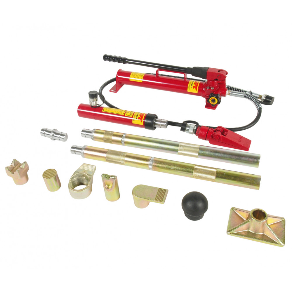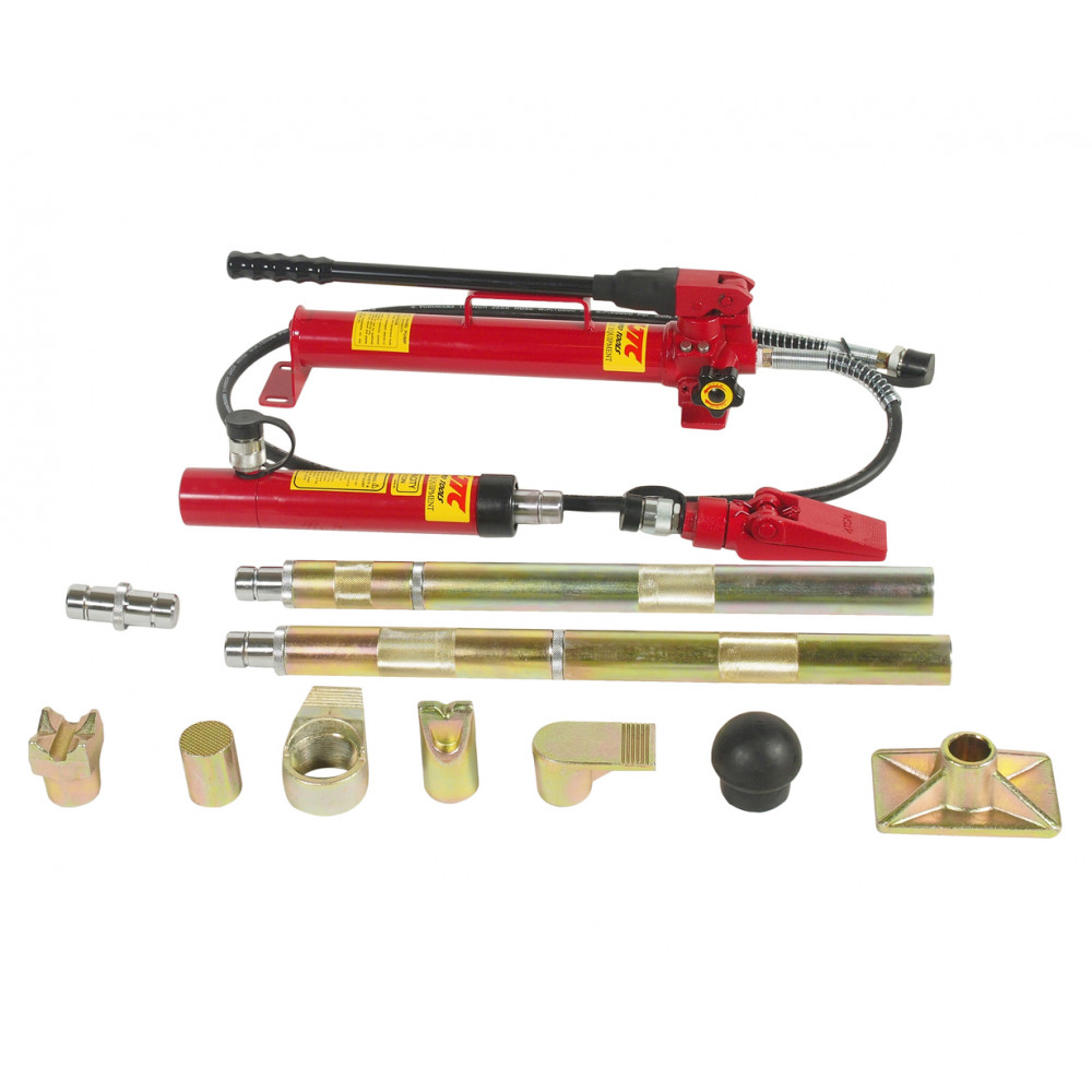 - Набір гідравлічного інструменту є компактним і зручним в експлуатації комплектом з гідравлічного насоса (1) і гідравлічного циліндра (3), за допомогою яких створюється робоче зусилля; подовжувачів для спрощення роботи (5-8); спеціальних фігурних насадок, що з'єднують (11-16), для надійного упору в деталі кузова.