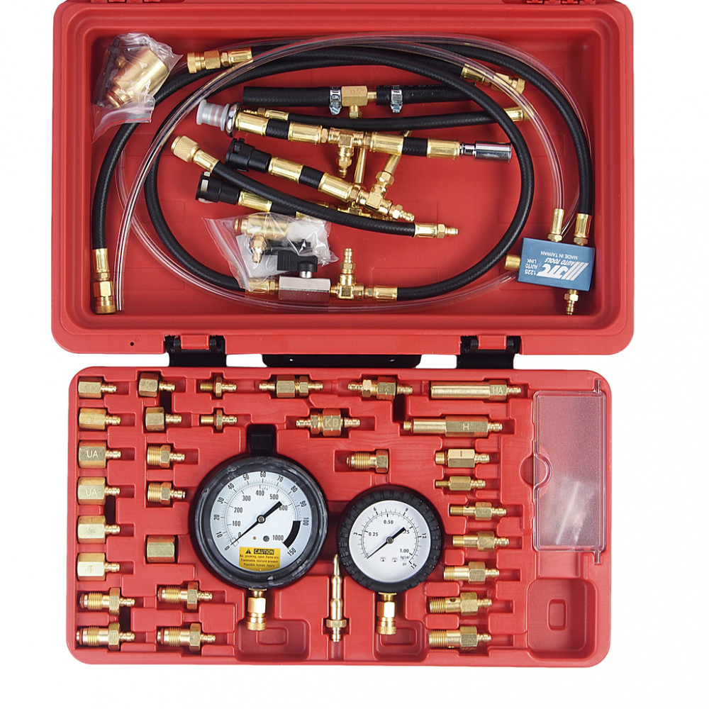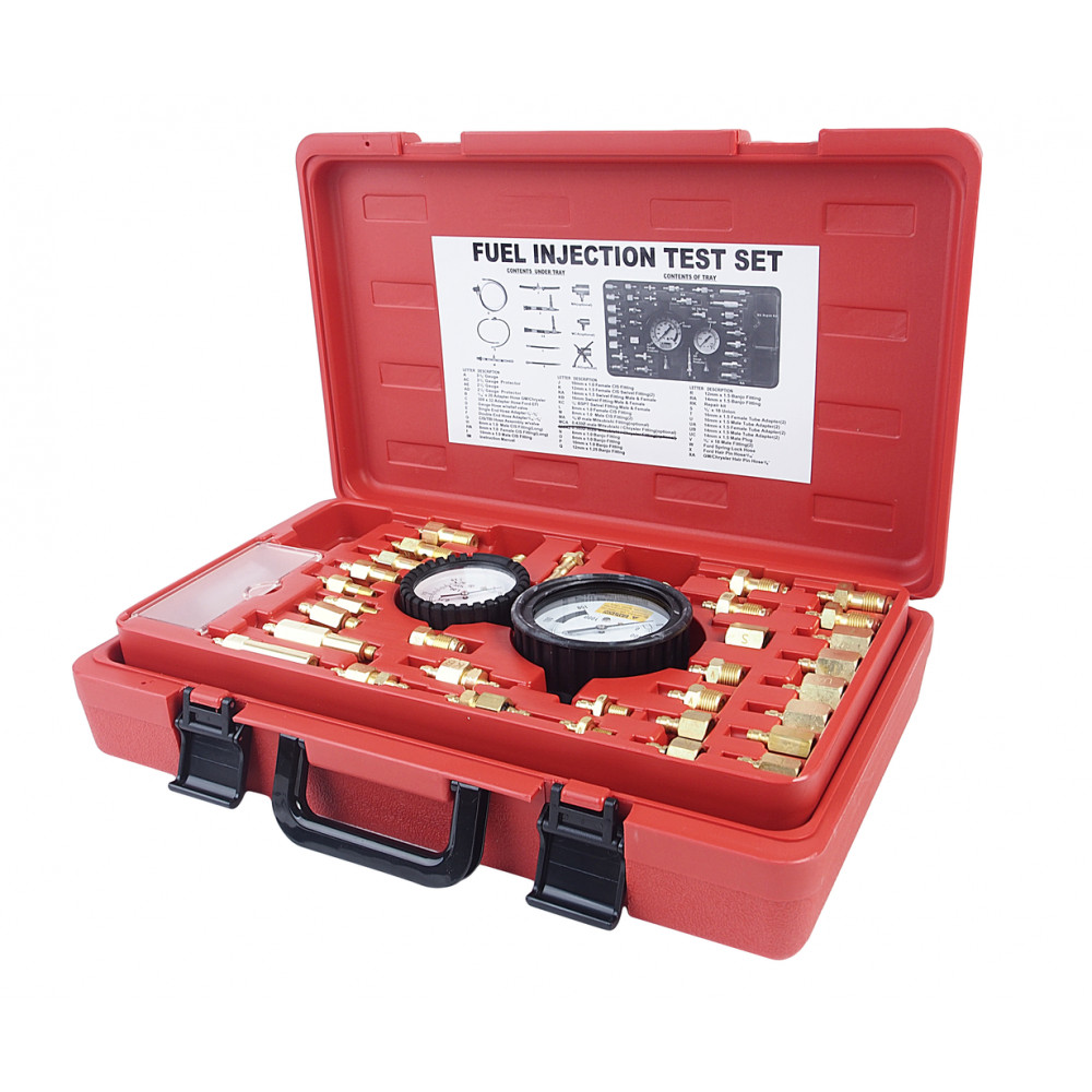 • В комплект входять манометр 3-1/2'' зі шкалами 0-145PSI і 0-1000кПа, манометр низького тиску 2-1/2'' (для тиску нже 15PSI), адаптери, шланги та різноманітні роз'єми для оперативної діагностики інжекторів, а також надійний пластиковий кейс та посібник з експлуатації.