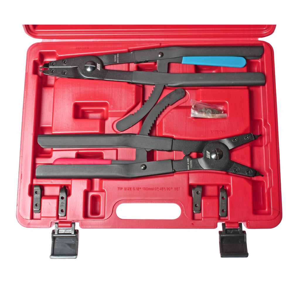 - У набір входять змінні наконечники. Кліщі з механізмом фіксації дозволяють безпечно утримувати стопорні кільця, оберігаючи їх від пошкодження.